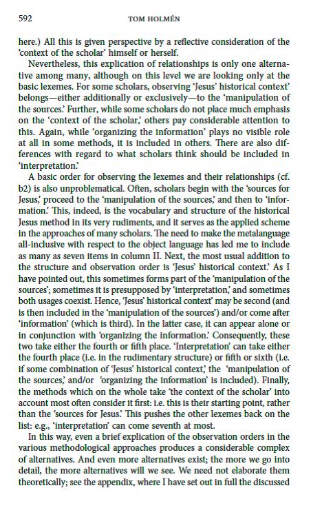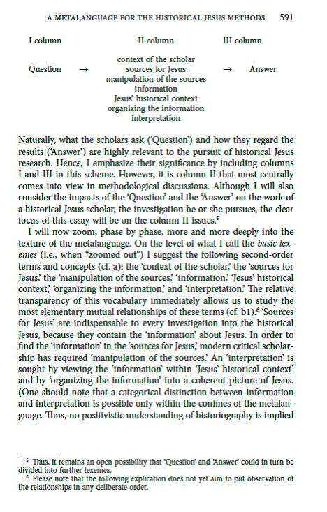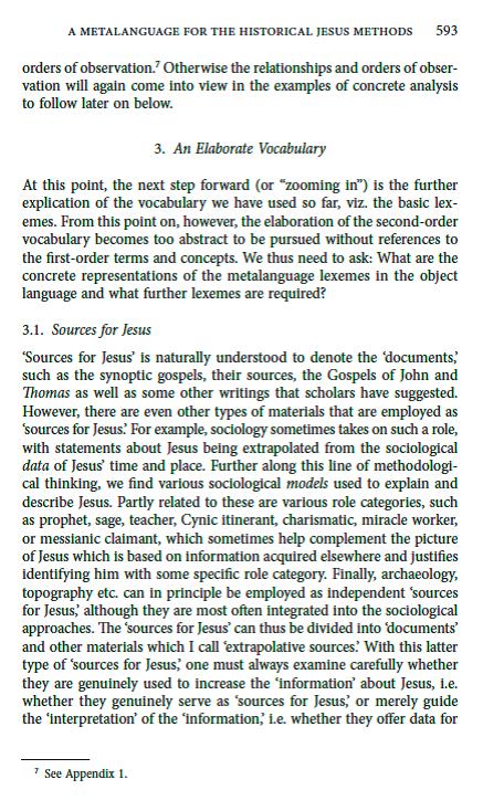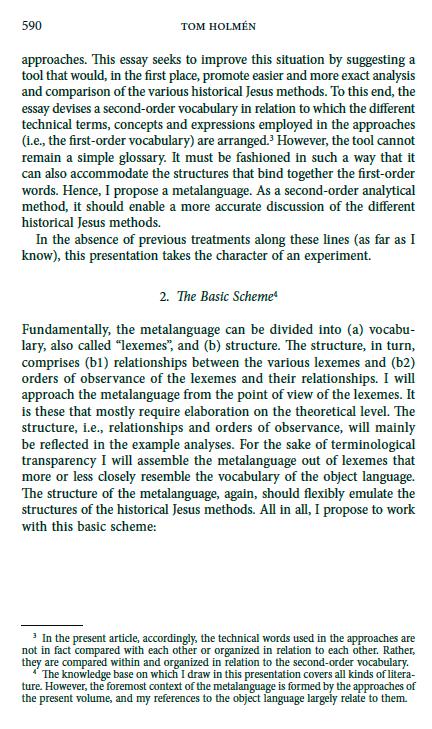 In the Handbook for the Study of the Historical Jesus, in its first volume (How to Study the Historical Jesus), and at the end of Part One of the volume (Contemporary Methodological Approaches), there is an article that at first was titled “A Metalanguage for the Historical Jesus Methods”. The article became a bit more avantgarde than I had planned. So I added the subtitle “An Experiment”.